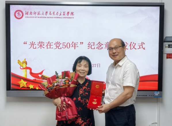 随后,李泳波向荣获“光荣在党50年”纪念章的徐晖同志颁发纪念章,并赠送鲜花。