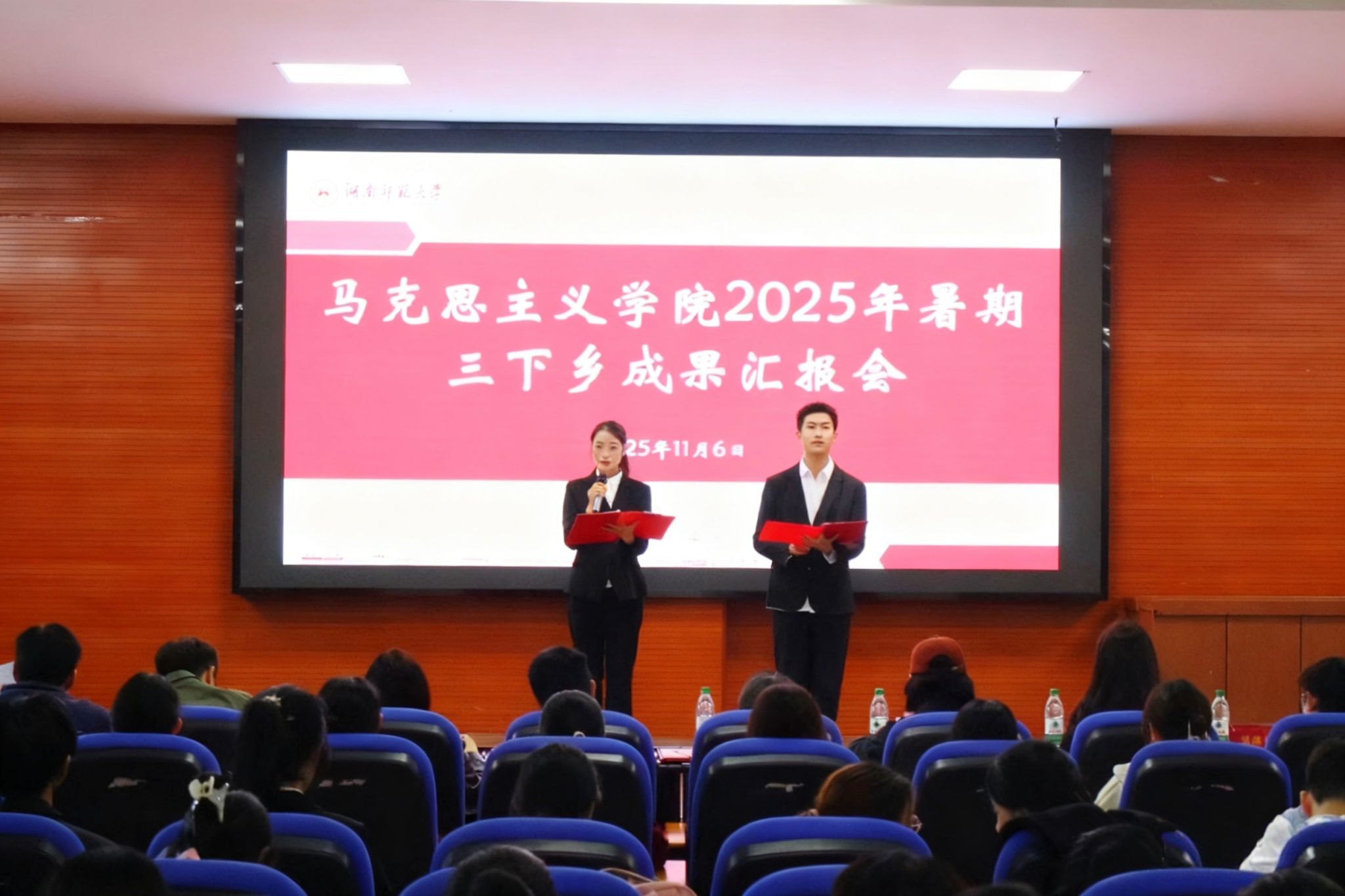 易珊在开场讲话中充分肯定了此次“三下乡”实践成果,向在场师生表示感谢与祝贺,并向同学们提出三点期望:一要坚守理论初心,在“学思践悟”中筑牢信仰之基;二要永葆实践热情,在“知行合一”中锤炼过硬本领;三要敢于担当作为,在“服务大局”中贡献青春力量,将实践收获转化为奋发进取的持久动力。随后,各实践团通过演讲、视频展播等形式进行成果汇报,展现出公司学子扎根基层、服务社会的切实作为与昂扬向上的精神风貌。