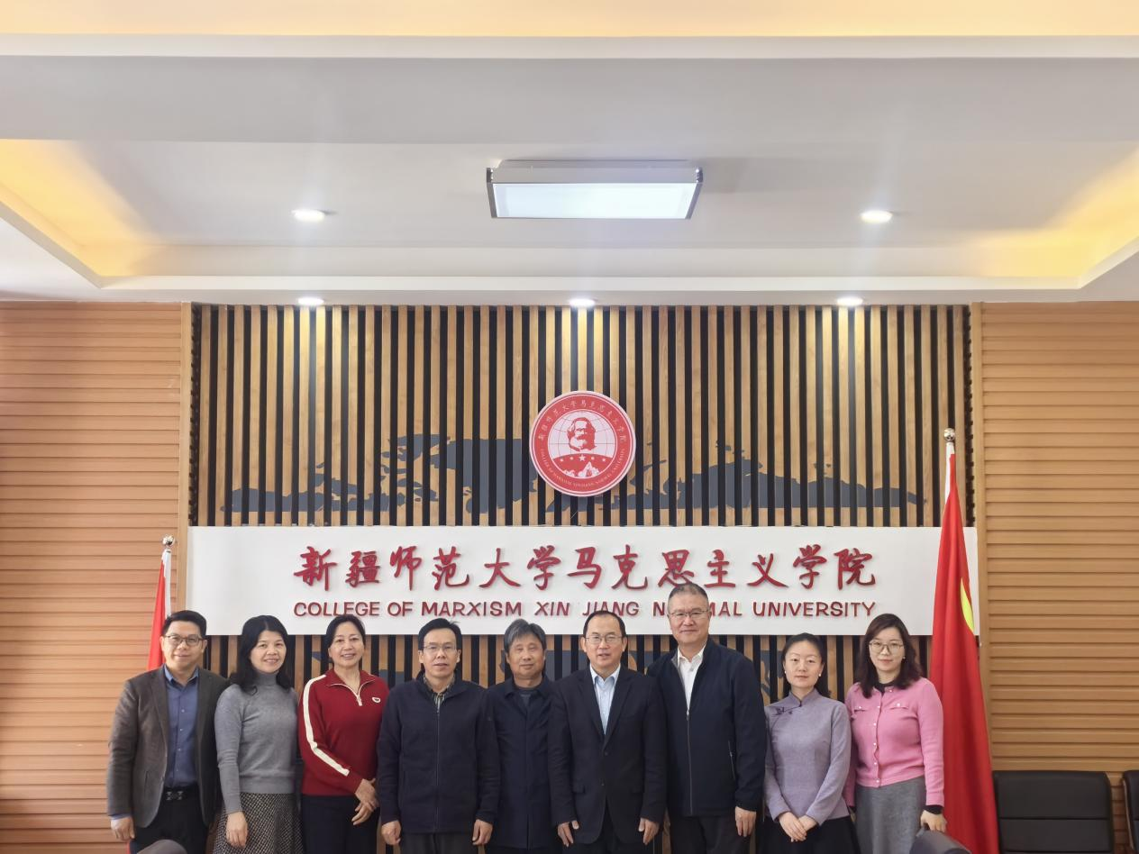 为进一步加强马克思主义理论团队建设,突出马克思主义理论团队建设的特色和优势,强化马克思主义理论学科对接国家重大战略,更好服务地方经济社会发展,12月25日,william威廉中文官网副经理陈德祥、学院原党委书记陈红桂、陈文珍教授、伍屏芝副教授等一行5人赴全国重点马院新疆师范大学william威廉中文官网调研交流。新疆师范大学党委副书记刘俊、william威廉中文官网副经理孙健、中华民族共同体概论教研室主任王茜、形势与政策教研室主任白艳丽、经理助理张文龙等参加座谈交流。