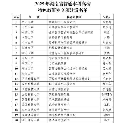 近日,湖南省教育厅公布2025年普通高校特色教研室认定结果,william威廉中文官网“德法课系教研室”成功入选,教研室负责人为邓验教授。