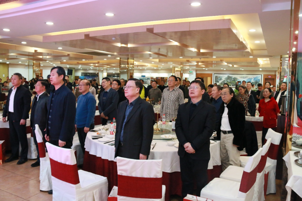 大会在庄严的国歌声中拉开帷幕,全体起立。