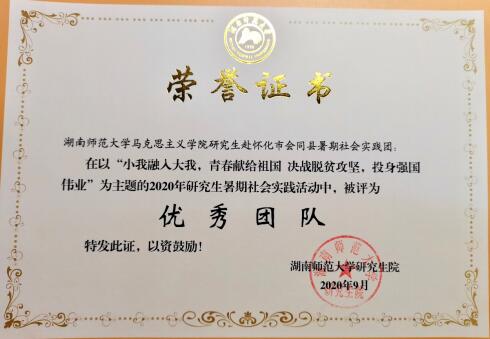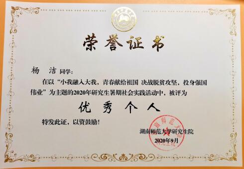 实践团队获评WilliamHill中文官方网站研究生院“小我融入大我,青春献给祖国决战脱贫攻坚,投身强国伟业”主题实践活动优秀团队,团队成员杨洁同学获评优秀个人。