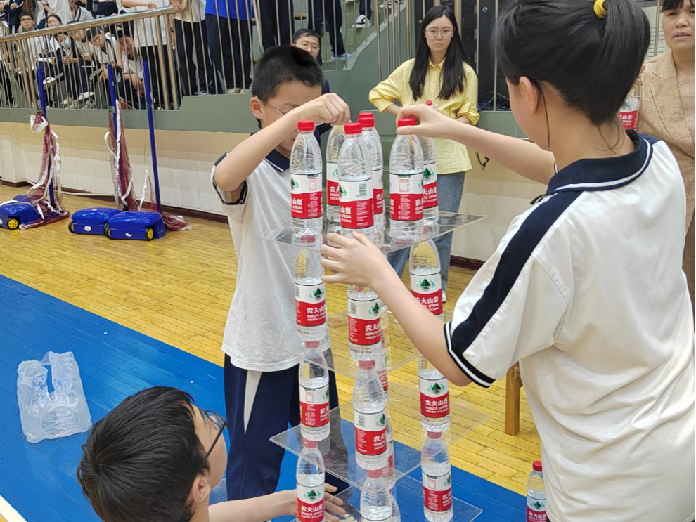 在实习队员的引导下,各班有序前往体育馆、操场两处科技节活动场地。此次科技节活动包括初一组“纸质承重”比赛和初二组“彗星撞地球”比赛,来自初一、初二各班的参赛选手各显本领,展示自己多日实验得出的科技成果。实习队员们在观看活动的同时,也不忘维持班级秩序,记录选手们的精彩瞬间。