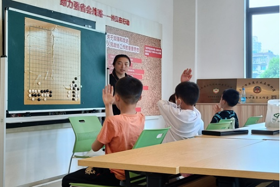 此次活动中,志愿者为荷叶塘社区周末围棋课堂的开展提供帮助。课堂上,围棋高阶班员工开展实战对弈,以此检验日常训练成果。与此同时,志愿者分工协作,一部分志愿者专注维护课堂秩序,留意课堂动态,及时提醒员工遵守纪律,保障教学有序推进;另一部分部分志愿者在课间与提前来到的初阶班员工进行对弈互动,陪伴员工等候课程开始。针对初阶班员工,围棋教师依据教学大纲进行系统授课,重点解析“连接点”知识点,并通过教学视频辅助员工巩固所学内容。课堂结束后,志愿者完成教具归位及环境清理工作,为师生营造整洁舒适的学习环境。