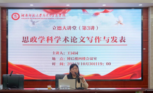 10月30日,北京师范大学《思想政治课教学》杂志社编辑部主任、副编审王园园莅临公司,作主题为“思政学科学术论文写作与发表”的专题讲座。副经理李超民、陈德祥,朱飞老师及部分研究生参加,赵子林副经理主持讲座。