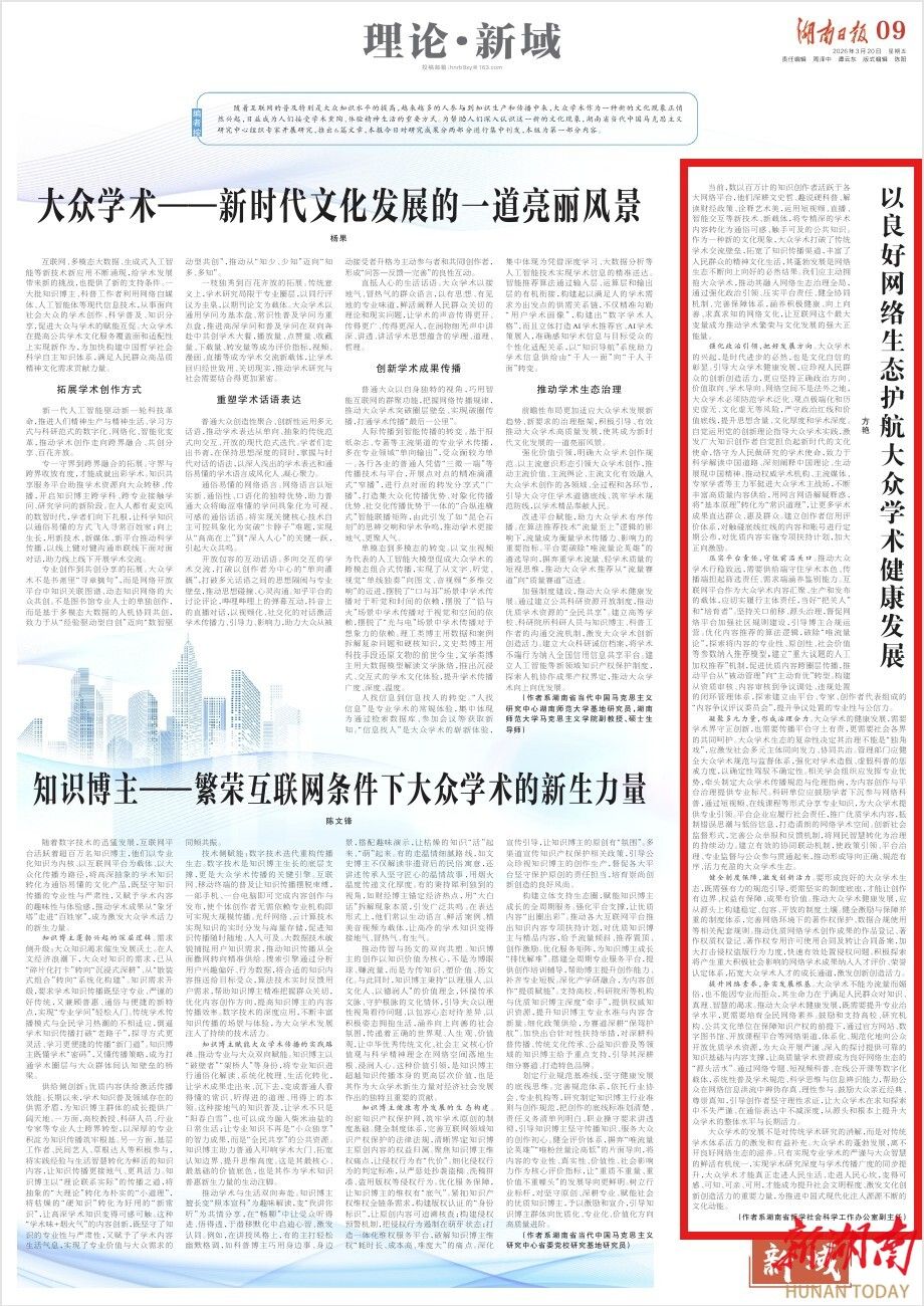 提升网络素养,夯实发展根基。大众学术不能为流量而媚俗,也不能因专业而拒众,其生命力在于满足人民群众对知识、真理、智慧的渴求。推动大众学术健康发展,既需要提升专业治学水平,更需要培育全民网络素养。鼓励和支持高校、研究机构、公共文化单位在保障知识产权的前提下,通过官方网站、数字图书馆、开放课程平台等网络渠道,体系化、规范化地向公众开放优质学术资源,为大众开展严谨、深入的探讨提供可靠的知识基础与内容支撑,让高质量学术资源成为良好网络生态的“源头活水”。通过网络专题、短视频科普、在线公开课等数字化载体,系统性普及学术规范、科学思维与信息辨识能力,帮助公众在网络信息洪流中辨伪存真、理性参与。鼓励大众亲近经典、尊崇真知,引导创作者坚守理性求证,让大众学术在求知探索中不失严谨、在通俗表达中不减深度,从源头和根本上提升大众学术的整体水平与长期活力。