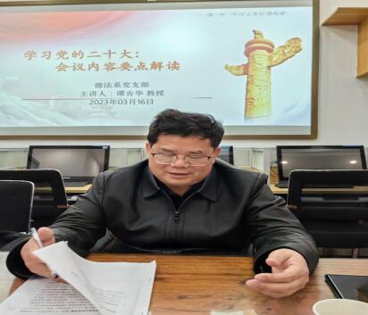 3月16日下午,《德法》课系党支部贯彻落实中共湖南省委教育工委《关于开展全省高校“新学期第一堂党课”活动的通知》要求,专题学习党的二十大精神。系党支部书记邓验老师主持专题学习。