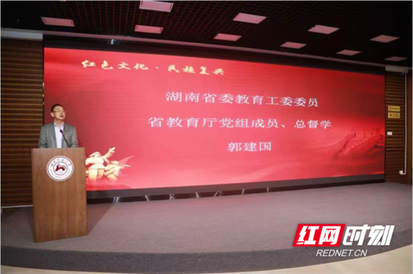 湖南省委教育工委委员、省教育厅党组成员、总督学郭建国发表讲话。他指出,红色文化是中国共产党精神血脉的重要载体,是党和人民宝贵的精神财富和奋进新时代的精神动力之源。湖南作为红色热土,发生了秋收起义、湘南暴动、通道转兵等重大历史事件,吾辈要时刻发扬好红色精神,赓续好红色血脉。