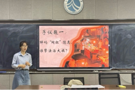 活动伊始,实习队成员丁可与贺敬茹依次上台展示完整课堂教学。试讲结束后,三位指导老师对此次试讲进行评课。温宇从课堂案例选材的全面程度、教学设计思路、课堂提问的有效性等多个维度出发,针对两位成员的试讲进行点评。同时,她就材料选取中存在的案例与知识点匹配度不足、时效性欠缺等问题,结合政治学科教学特点,为两位队员提供了系统且可操作的优化建议。伍屏芝围绕选材的生活化程度、活动设计的合理性、板书书写位置及内容,就教学设计中存在的共性问题及相应优化路径,为实习队员们提供了专业的修改意见。罗帅则聚焦师生互动的有效性、教师用语的规范性、课堂生成处理的灵活性等,提出针对性教学优化建议。